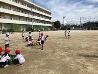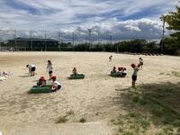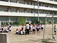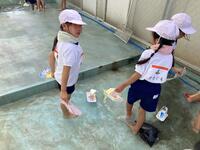 校庭では容器の水でっぽうがあちらこちらで勢いよく水を飛ばしています。