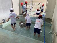 プール出入り口の足洗い場やシャワー部分に水をため、簡易の水遊び場としました。