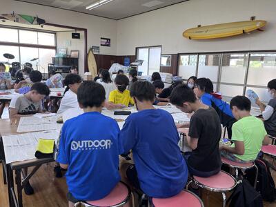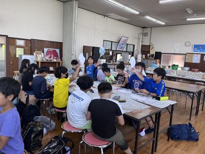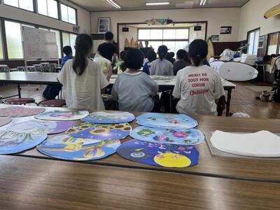 各学級、民宿に着き次第、房州うちわづくりを行いました。