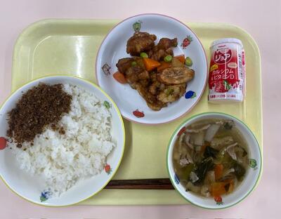 山口県で人気のある給食メニュー☆揚げた肉と野菜を甘辛く味つけします。