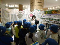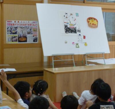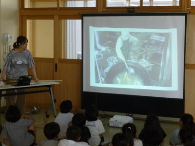 栄養士から毎日食べている給食がどのように作られているか、給食室の様子を教えてもらいました。