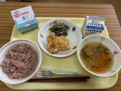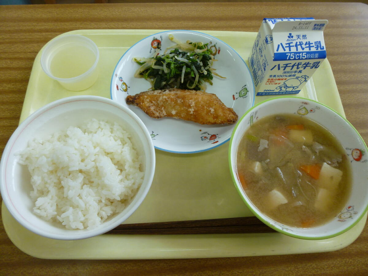 牛乳、ごはん、すまし汁、いわしのカリカリフライ、納豆和え、きなこもちです。