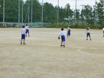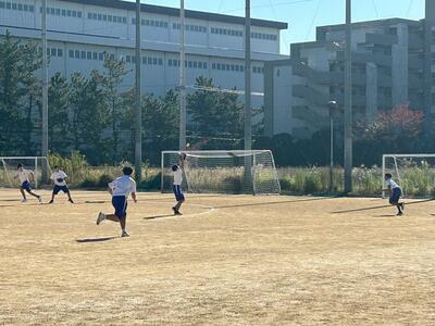 塩浜学園の広い校庭でサッカーをしました。写真は各チームごとの、ゲーム前の練習風景です。