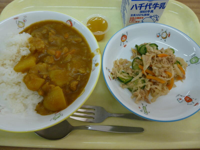 この日はチキンカレーと切り干し大根サラダ、ゼリーでした。9月に入って最初の給食でした。どのクラスの食缶もきれいに空になっていました。