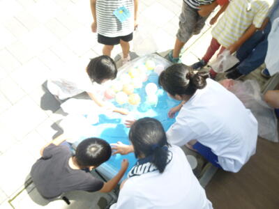 1年生の学校探検の最中、7年生は理科の実験をしていました。薬品を加熱し、沸点の様子を確認していました。