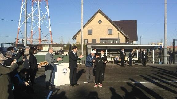 本校児童が代表としてあいさつをし、グローブを贈呈された