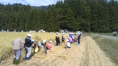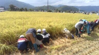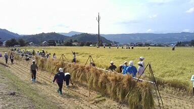 稲刈り 投稿日時 : 2023/09/13 塩焼小学校管理者 自然教室の稲刈りの様子です。農家の方から説明を聞き、初めての 稲刈りに挑戦しました。稲を刈り、束ねて結び、はぜかけをする。 大変な作業でした。