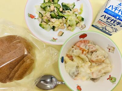 胚芽パン マカロニクリーム煮 お豆のサラダ 牛乳