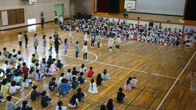 4月28日に、1年生を迎える会を行いました。児童委員が司会進行し、各学年が入れ替わり、1年生に学校紹介の発表をしました。