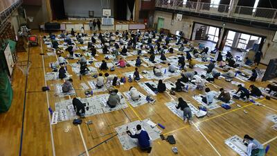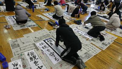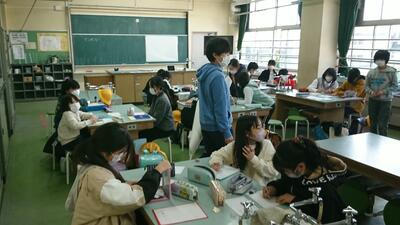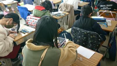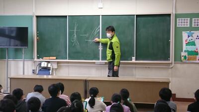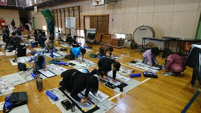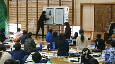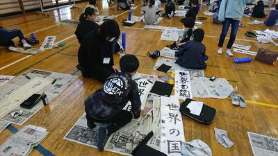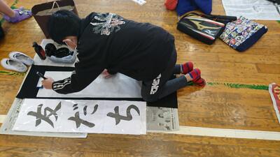 特別講師の先生を招いて、ポイントを教えていただき、書き初めの練習をしました。