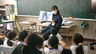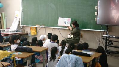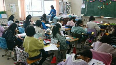 4年生が外部講師から、彫刻刀の使い方について教わりました。これから木版画に取り組みます。