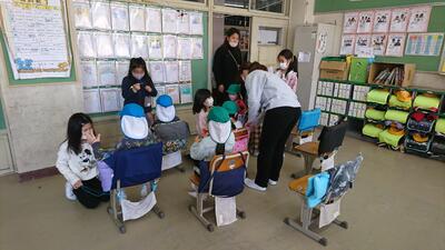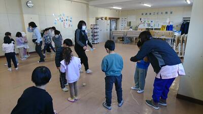 幼稚園・保育園の年長組の園児を招いて、1年生が昔遊びを教えるなかよし交流会を行いました。コロナ禍で3年間実施できなかったので、久しぶりの交流会です。今日は、1年4.5組が交流しました。
