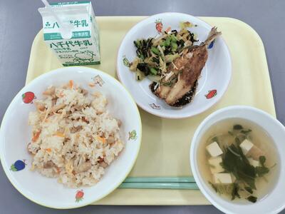大豆ごはん、いわしのごま酢ソースかけ、青菜ともやしの海苔おかかあえ、すまし汁、牛乳