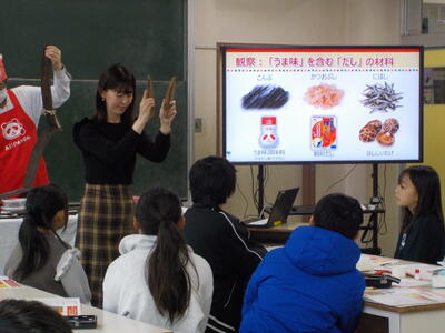 うま味は、日本人が発見し、世界共通語であることや、味噌の香りがする薄い味噌水にうま味調味料を入れると、味が格段に美味しくなることを体験したり、だしをとる昆布や煮干し、椎茸の香りをかいだりしました。