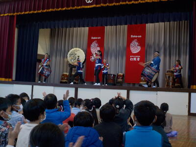 今日は4年ぶりに体育館において全学年で芸術鑑賞教室を行いました。創作和太鼓集団「打鼓音(だこおん)」さんの迫力ある和太鼓を鑑賞しました。