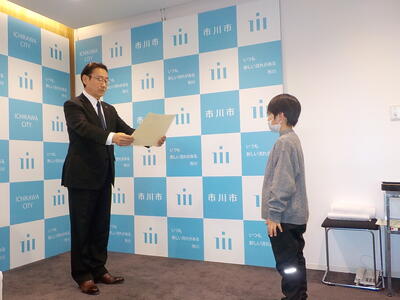 4年生の児童が、市川市交通安全ポスターコンクールにおいて入賞をしました。表彰式が行われ、田中市長より授与されました。頑張りましたね。