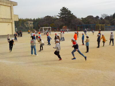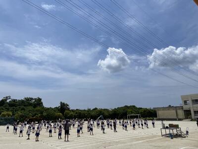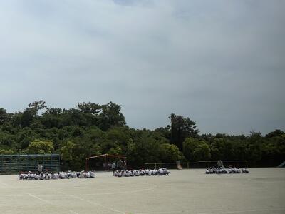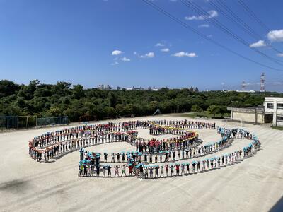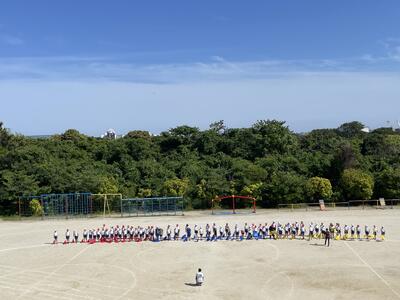 PTAの皆様が企画してくださり、創立45周年を記念しての航空写真撮影をしました。全校児童で校庭に大きなかも兄を描きました。出来上がりが楽しみですね。