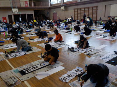 学年全体で体育館を使用した書初め練習を開始しました。予定を確認していただき道具の準備をお願いします。