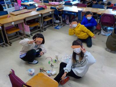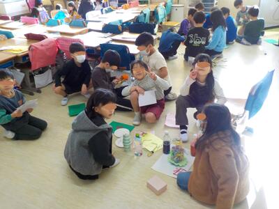 市制施行90周年を盛り上げるプロジェクトとして、記念缶バッジを作りました。低学年には難しいため、ペア学年で上の学年が下の学年に教えながら作業しました。出来上がると拍手が起こり、喜びの声が上がっていました。