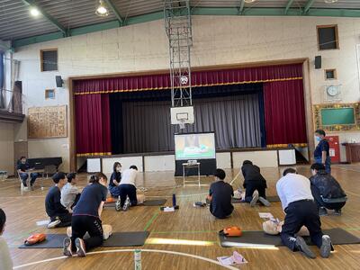 防災教育の一環で、学校の防災倉庫の中にあるものについて学習をしました。市の防災課の方が詳しく丁寧に説明してくださいました。