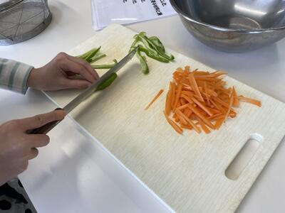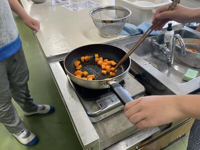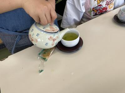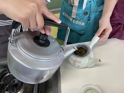 クッキングはじめの一歩として、お茶のいれ方を学びました。ガスコンロの使い方やお茶のいれ方を知り、味わって飲んでいました。