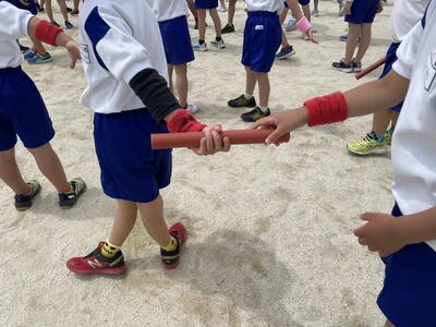 業間休みと昼休みに代表児童がリレーの練習を行っています。