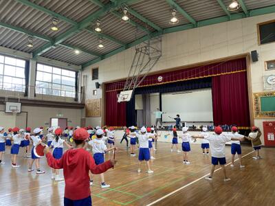 入場から隊形移動まで、曲に合わせての動きを学習しました。ダンベルを持って、力強く踊っていました。
