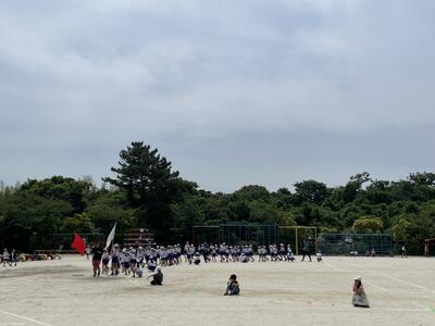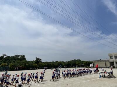 運動会では、リレー選手の入場を応援団が先導します。今日は、流れを確認するために、応援団とリレー選手が合同で練習しました。