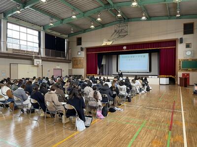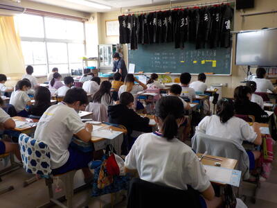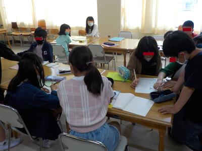 3年生が1年生に対して、町の安全マップについて説明しました。3年生は練習してきた成果がしっかりと出せましたね。1年生も真剣に3年生の説明を聞いていました。
