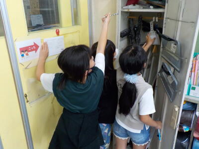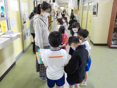 2年生の案内で、1年生の学校探検を行いました。学校のいろいろな場所に訪問して、マップに印をつけていきました。「図工室っておもしろい!」など興味津々で探検をすることができました。