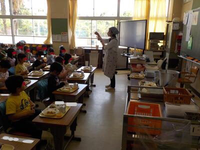1年生が給食を準備している様子です。給食当番が一生懸命準備をしていました。