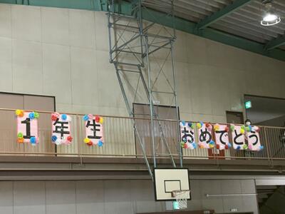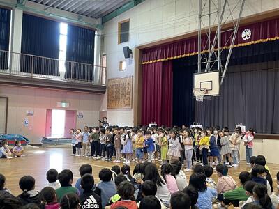 一年生を迎える会をしました。全校で一年生にプレゼントを渡した後は、お礼に一年生から歌のプレゼントがありました。
