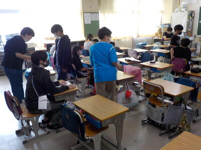 5月2日に予定している「全学年歩き遠足」に向けて、一緒に行動するペアの学年(1・6年、3・5年)の交流会です。グループの顔合わせや遠足の時にどのようなことをするか一緒に考えました。