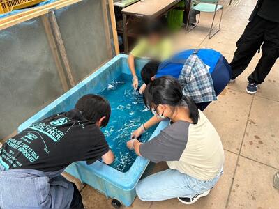 セントラルスポーツクラブの方を講師にお招きして、着衣泳をしました。服を着て、靴を履いたまま歩いたり泳いだりすることで、動きにくさを体感していました。ペットボトルや空気を含ませた洋服、履いている靴が浮くことも学び、浮いて待つことを実践的に学ぶこともできました。自分の命を守るための学習ができました。講師のみなさま、貴重な体験をさせていただきありがとうございました。