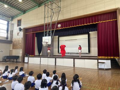 チーバくんがダンスを教えに来てくれました。準備運動やじゃんけん、ダンスレッスン等、チーバくんのかわいい動きを真似しながら楽しみました。チーバくん、南新浜小学校に来てくれてありがとうございました。
