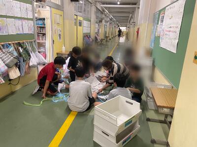 業間休みに予告なしの避難訓練を実施しました。事前に、教室以外の場所で地震が起きても、自分の命を守る行動ができるように確認をしていたので、子どもたちは落ち着いて行動ができていました。最後に、安全主任の先生から身を守るポイントを放送で教えていただき、訓練を終えました。ご家庭でも、地震が起きた時の行動を話し合ってみてください。
