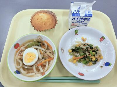 今日の給食は「うどんドンドコ」というお話のお月見うどんです。