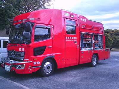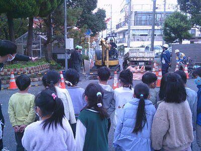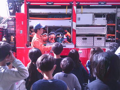 消防車が来たので、1年生は国語で学習した「はたらく自動車」を間近で見ることができました。エアコン工事のためにショベルカーもいました。