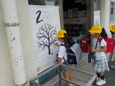朝のあいさつ運動を実施しています。代表委員が校門に立ち、登校してくる児童にあいさつをします。あいさつができたら児童はシールをもらい、「学年の木」にシールを貼っていきます。元気なあいさつがたくさん聞こえました。