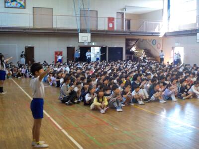 夏休みを迎える会を体育館で行いました。吹奏楽部の演奏で校歌を歌った後、校長先生のお話や生徒指導の先生のお話をしっかりと聞いて、夏休みのめあてを確認することができました。また、表彰も行い、頑張った児童を全校で讃えました。