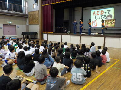 朝学習の時間に、以前5年生に実施した女性消防団員による防災教育を、今日は3年生に実施しました。AEDの利用について紙芝居の読み聞かせを行いました。