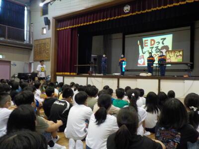4~6年生は(株)明治の方に「すすんで運動・しっかり食べよう」というテーマでクイズや体操を混ぜながらお話をしていただきました。