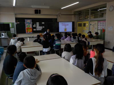 今日は朝の時間、4年生を対象に「かるがもサークル」の方々による読み聞かせを行いました。