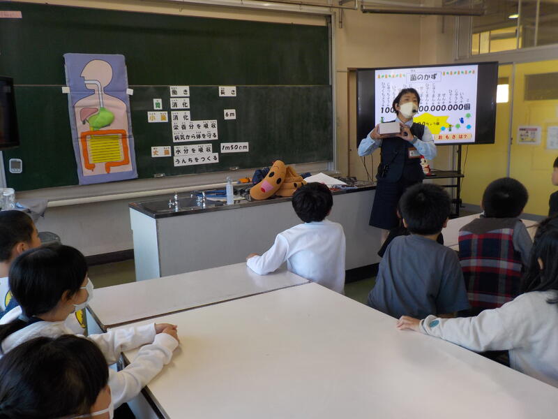 学校保健委員会の一環で、3年生は(株)ヤクルト販売の方をお招きして「早ね、早おき、朝ごはん、朝ウンチ」をテーマに、生活習慣について出前授業をおこなっていただきました。