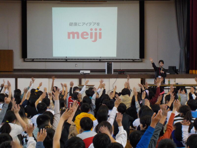 4~6年生は(株)明治の方に「すすんで運動・しっかり食べよう」というテーマでクイズや体操を混ぜながらお話をしていただきました。
