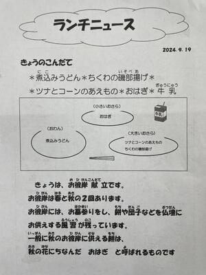 PTAの方が、1年生の保護者を対象に給食試食会を企画してくださいました。はじめに、栄養士による給食についての説明がありました。次に、配膳の様子を見学していただきました。最後に、給食を試食しました。今日はお彼岸メニューで、おいしかったという感想をたくさんいただきました。