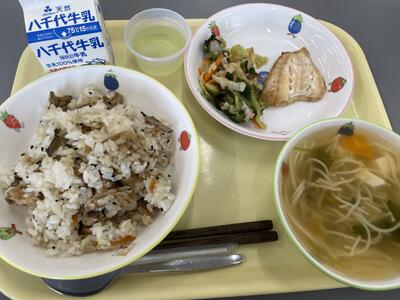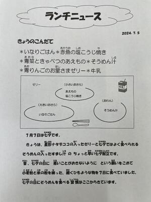 今日の給食は七夕献立でした。そうめん汁には星型のたまご焼き、ゼリーの中には星型のナタデココが入っていて、子どもたちが喜んでいました。