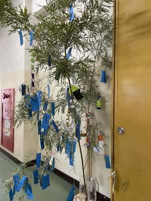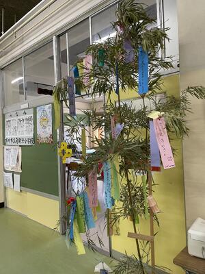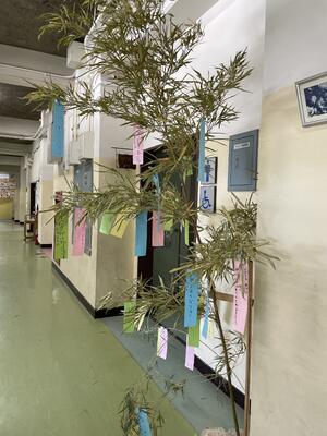 1,2年生の廊下には、七夕飾りが飾られています。短冊には、将来の夢や頑張りたいこと、家族の幸せや健康についての願いごとが書かれていました。願いごとが叶うといいですね。