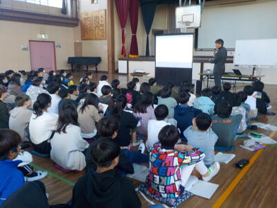 4~6年生は(株)明治の方に「すすんで運動・しっかり食べよう」というテーマでクイズや体操を混ぜながらお話をしていただきました。