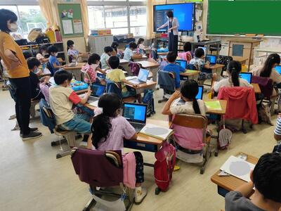 GIGAスクール構想用のタブレットPCを、1年生でも使い始めています。ICT支援員の先生にも授業に入っていただき、電源の入れ方やシャットダウンの仕方など、基本的な使い方から少しずつスタートしています。